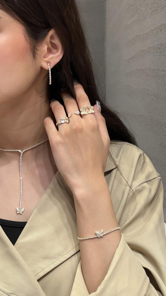 - القلادة: تصميم طويل ناعم ينتهي بفراشة متلألئة تضفي جمالاً أنثوياً على الرقبة.
