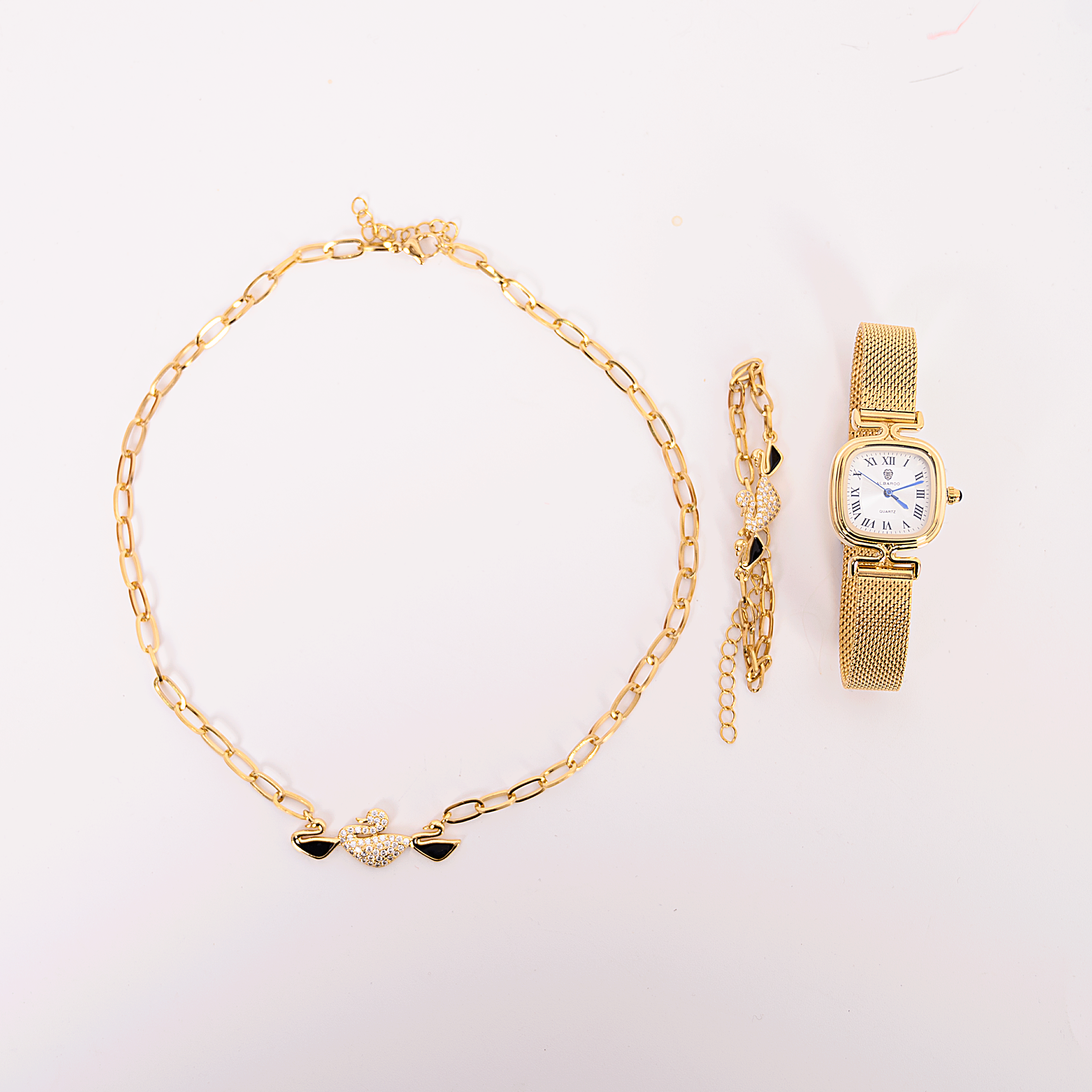 اكتشفي روعة الأناقة مع طقم ساعات مربعة نسائية والسلسال والأسوارة بنمط بطة زركون الفاخر.