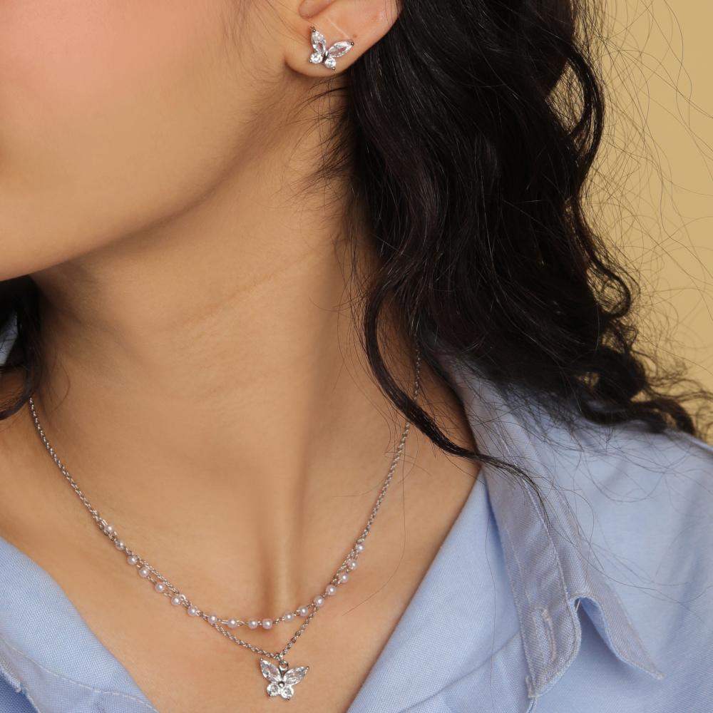 طقم فضي بفراشات مرصعة وطبقات ناعمة من اللؤلؤ