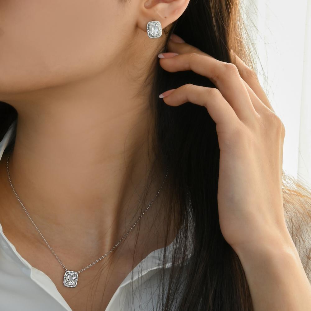 تميّزي بإطلالة أنيقة وهادئة مع طقم حلق وسلسال بتصميم كلاسيكي ناعم يبرز بساطة الفخامة في كل تفصيلة. يتكوّن الطقم من سلسال رقيق وأقراط صغيرة مزينة بفصوص زركون مربعة براقة تضيف لمسة راقية لإطلالتك اليومية أو الرسمية.