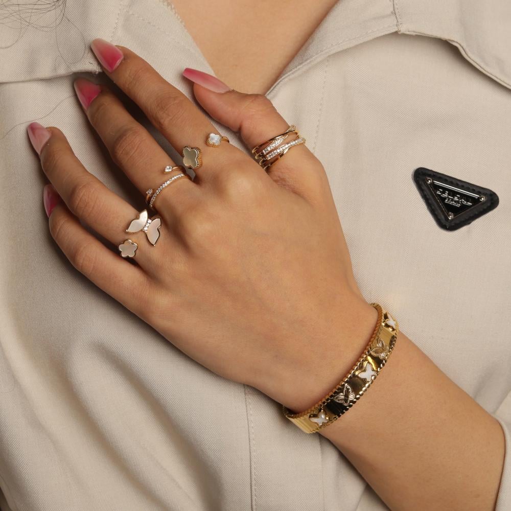 مجموعة أنيقة ذهبي 4 قطع خواتم زيركون مع سوارة ستانلس ستيل بتصميم فراشات
