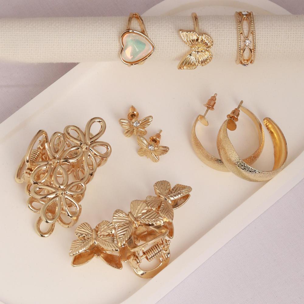 أبرزي جمالك بإطلالة راقية مع هذه الاكسسوارات الذهبية المستوحاة من الطبيعة. مجموعة أنيقة ومميزة تمنحك لمسة من السحر والجاذبية لتكملة مظهرك في كل مناسبة.